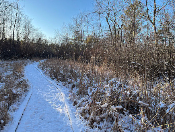 Gentle walk on the wooden boardwalk through frozen wetlands and quiet forest.